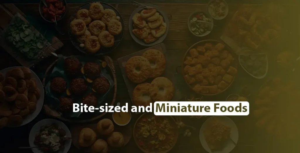 Mini portions of food are popular because they allow guests to try several different dishes without feeling too overstuffed. Small, bite-sized appetizers or desserts can complement a reception with mingling and socializing guests just perfectly. These mini bites will also make your food look more elegant and fun, and they can be specially created to match your wedding theme or colors. Secondly, they are very easy to serve and eat without interrupting the flow of an event.